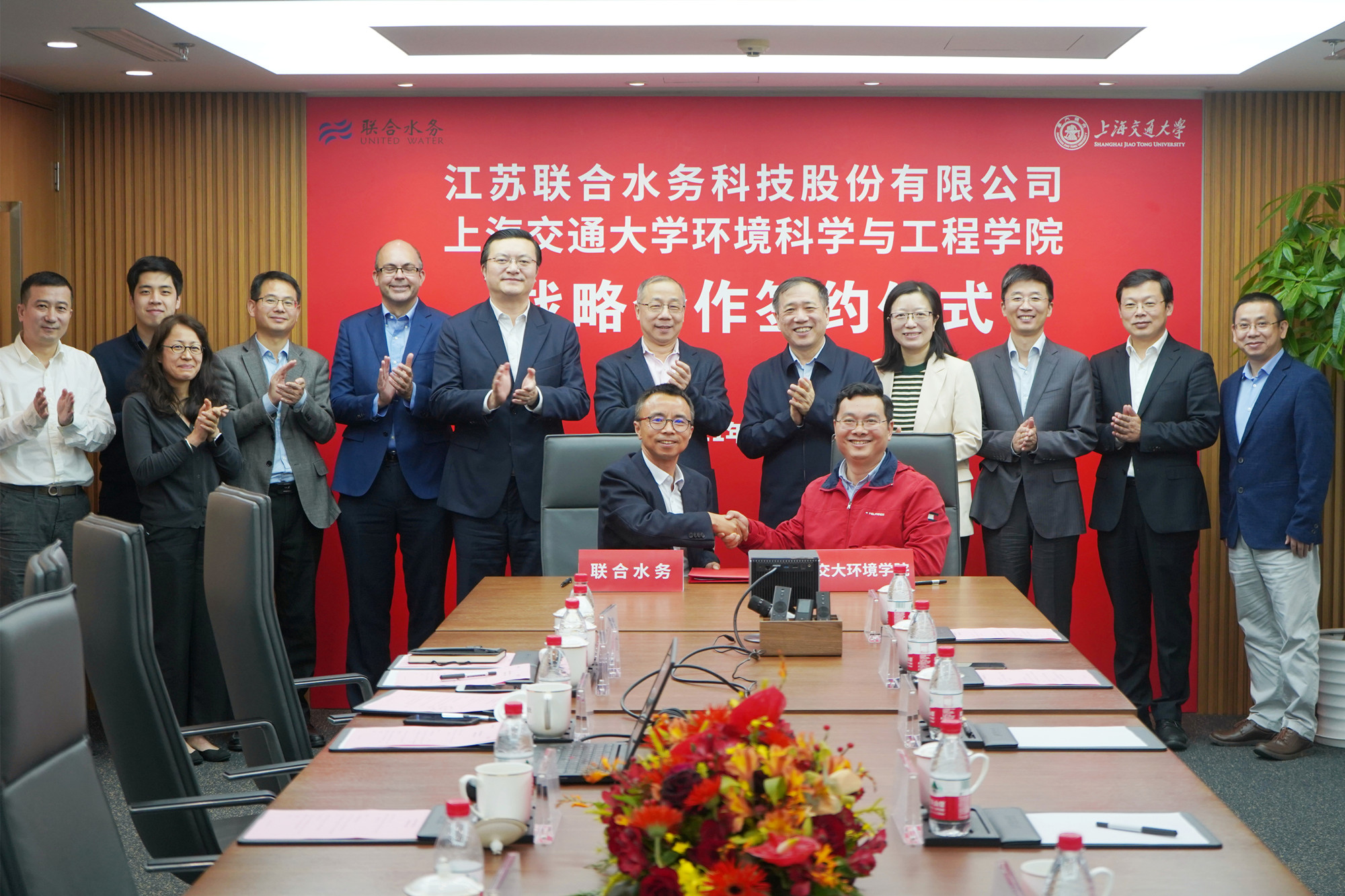 陳樵和趙一新代表雙方簽署了戰略合作協議。聯合水務和上海交大環境科學與工程學院將在共建聯合研發中心、促進科技成果轉化以及開展人才培養等方面開展深入合作。